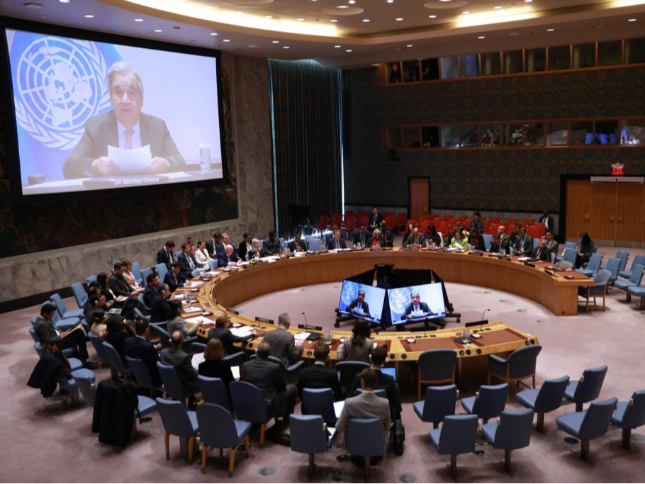10月24日,在位于纽约的联合国总部,正在越南访问的联合国秘书长古特雷斯通过视频在安理会“展望联合国未来”公开辩论会上发表讲话。新华社记者 谢锷 摄