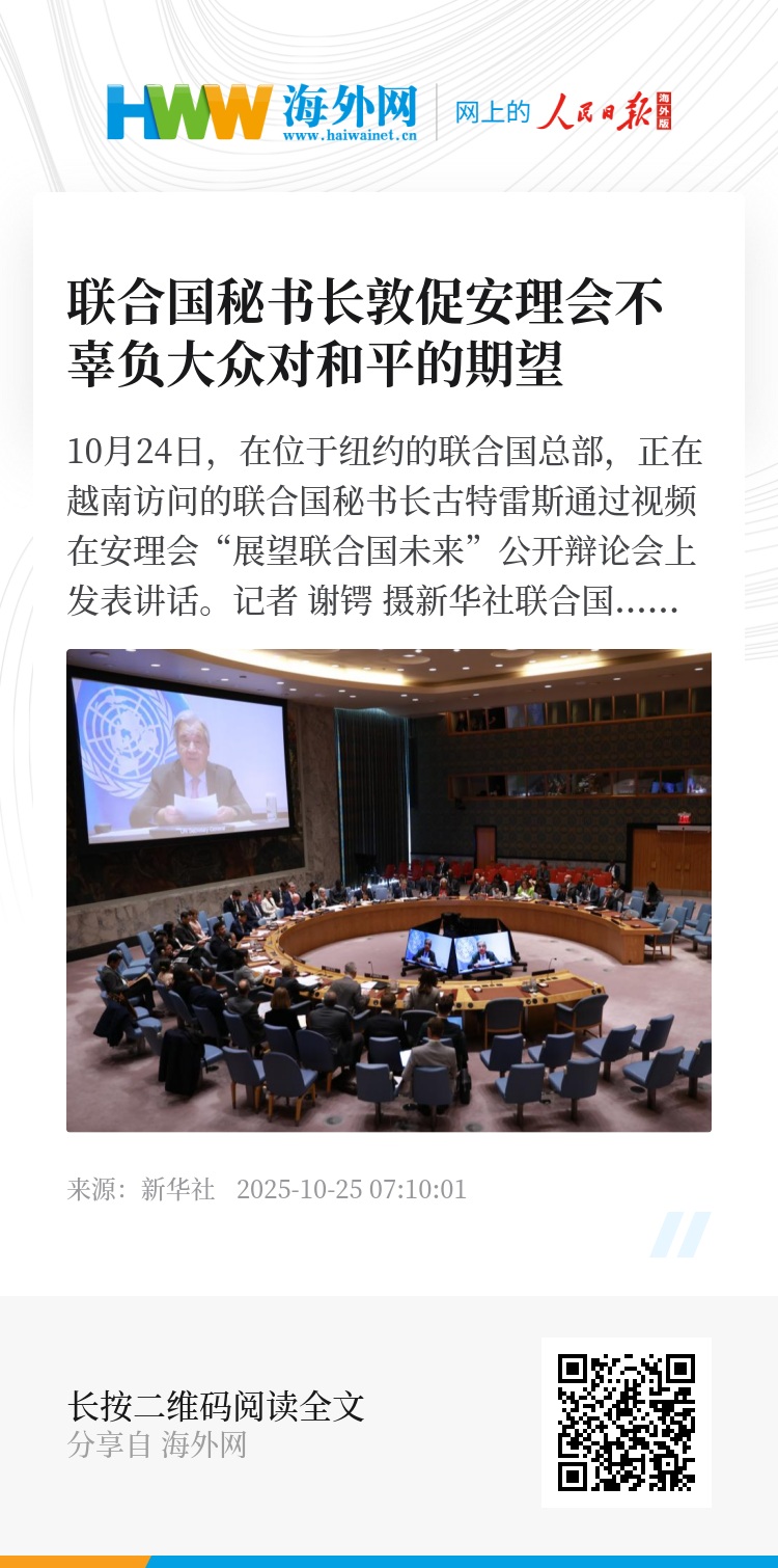 新华社联合国10月24日电(记者尚绪谦)今年10月24日是《联合国宪章》生效80周年纪念日。联合国秘书长古特雷斯当天在安理会“展望联合国未来”公开辩论会上发表讲话,敦促安理会不辜负大众对于和平的期望。