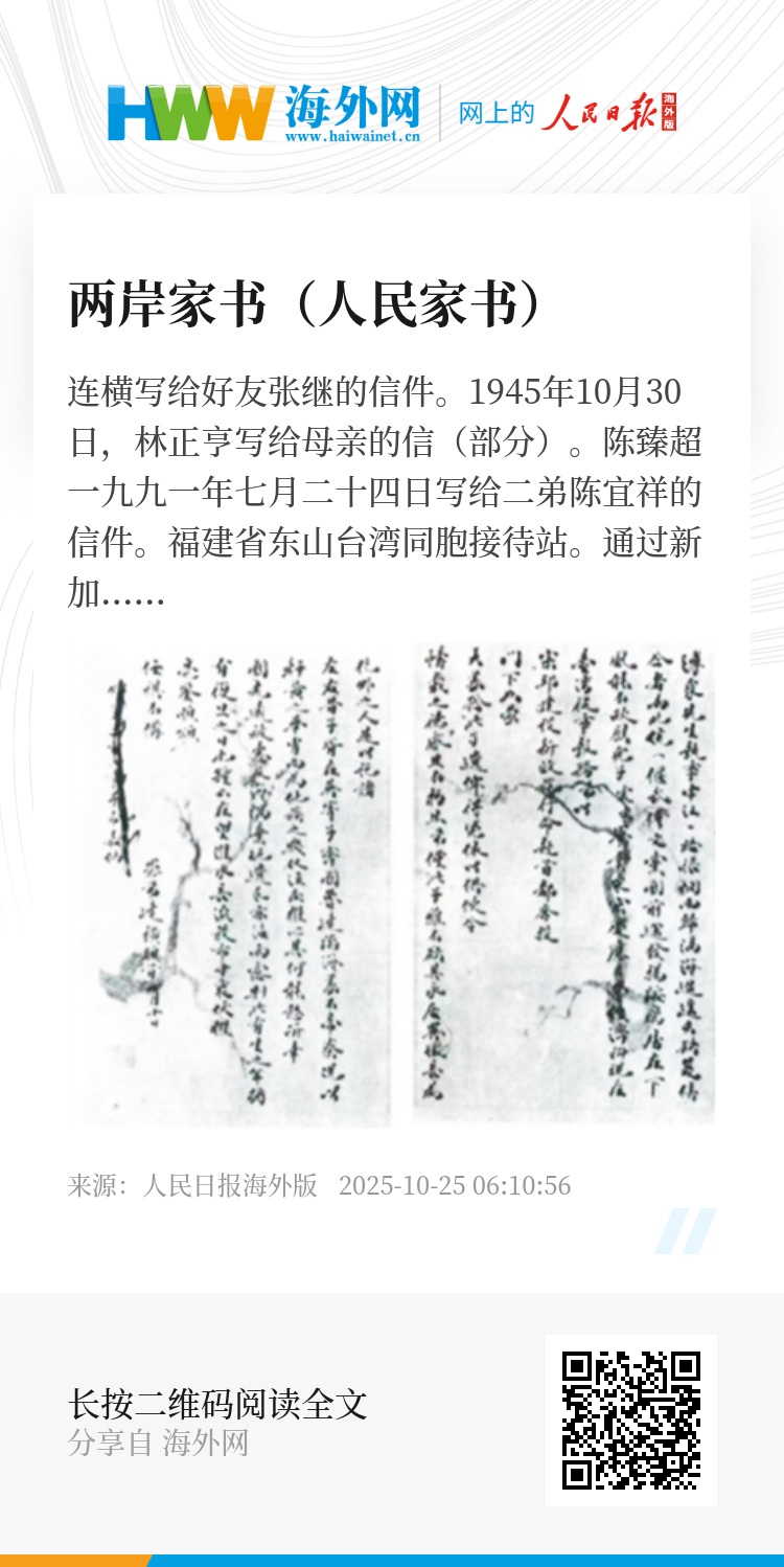 在这个特别时刻,本报“人民家书”聚焦海峡两岸,摘编5封跨越时空的“两岸家书”,重现斑驳字迹背后剪不断、离不散的至真至情。这一封封跨越海峡的家书,不仅记录着家族的变迁、亲情的牵挂,更承载着中华民族共同的历史记忆和文化血脉。它们以最真实、最温暖的方式,诉说着“两岸一家亲”的深厚情感,寄托着对祖国统一、民族复兴的深深期盼。