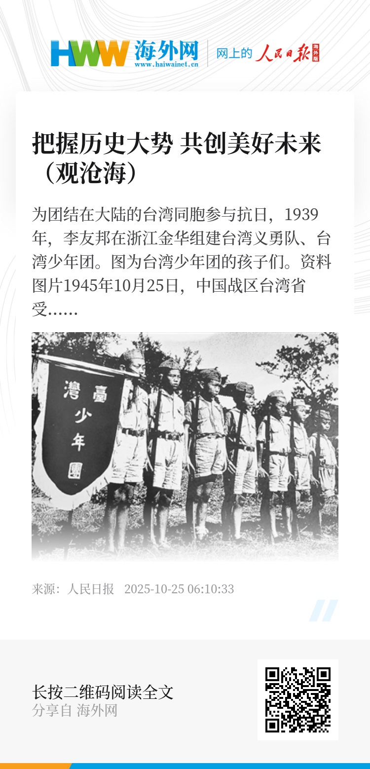 80年前的伟大胜利,彻底粉碎了日本军国主义殖民奴役中国的图谋,开启了古老中国凤凰涅槃、浴火重生的新征程,更无可辩驳地证明台湾是中国领土不可分割的一部分。