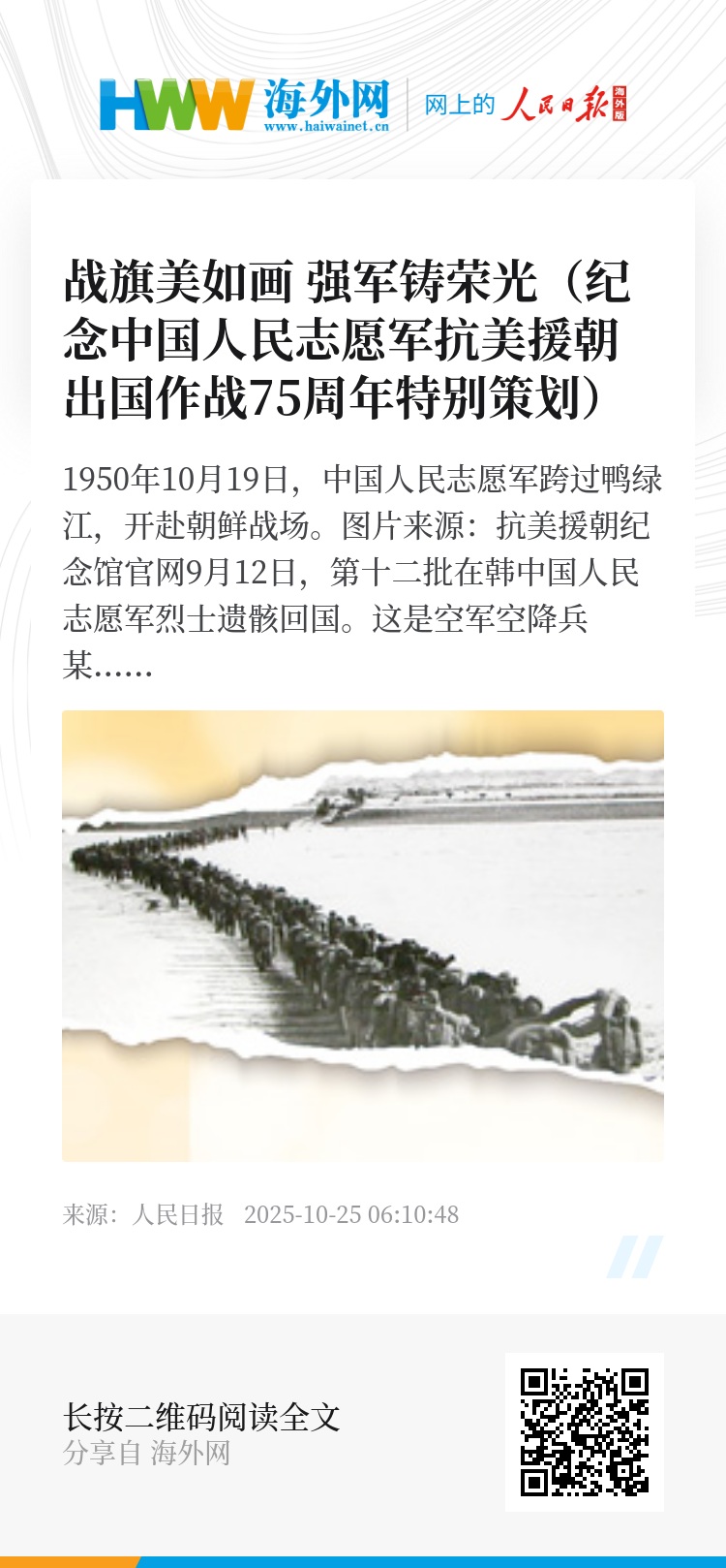 1950年10月19日,中国人民志愿军跨过鸭绿江,开赴朝鲜战场。