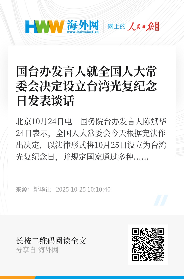 新华社北京10月24日电 国务院台办发言人陈斌华24日表示,全国人大常委会今天根据宪法作出决定,以法律形式将10月25日设立为台湾光复纪念日,并规定国家通过多种形式举行纪念活动。最高国家权力机关常设机关这一庄严决定,集中反映了包括台湾同胞在内的全体中华儿女的共同心愿和集体意志,是捍卫台湾光复、回归祖国这一重要史实和民族荣光的有力举措。