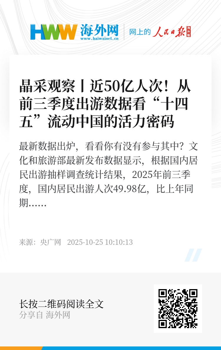 文化和旅游部最新发布数据显示,根据国内居民出游抽样调查统计结果,2025年前三季度,国内居民出游人次49.98亿,比上年同期增加7.61亿,同比增长18.0%。