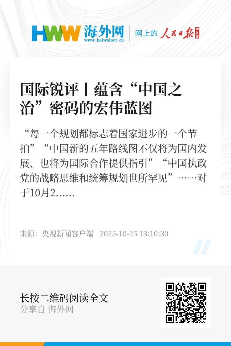 从全球看,五年规划并非中国独有,也不是中国首创,然而坚持接续编制和实施五年规划的唯有中国。“中国之治”最重要的密码便是中国共产党的领导及其秉持的以人民为中心的发展思想。《建议》指出“十五五”时期经济社会发展必须遵循“6个坚持”原则,前两条即是“坚持党的全面领导、坚持人民至上”。中国式现代化,民生为大。巴西《论坛》杂志网站22日刊文指出,中国的成功取决于历史耐心与政策延续性。