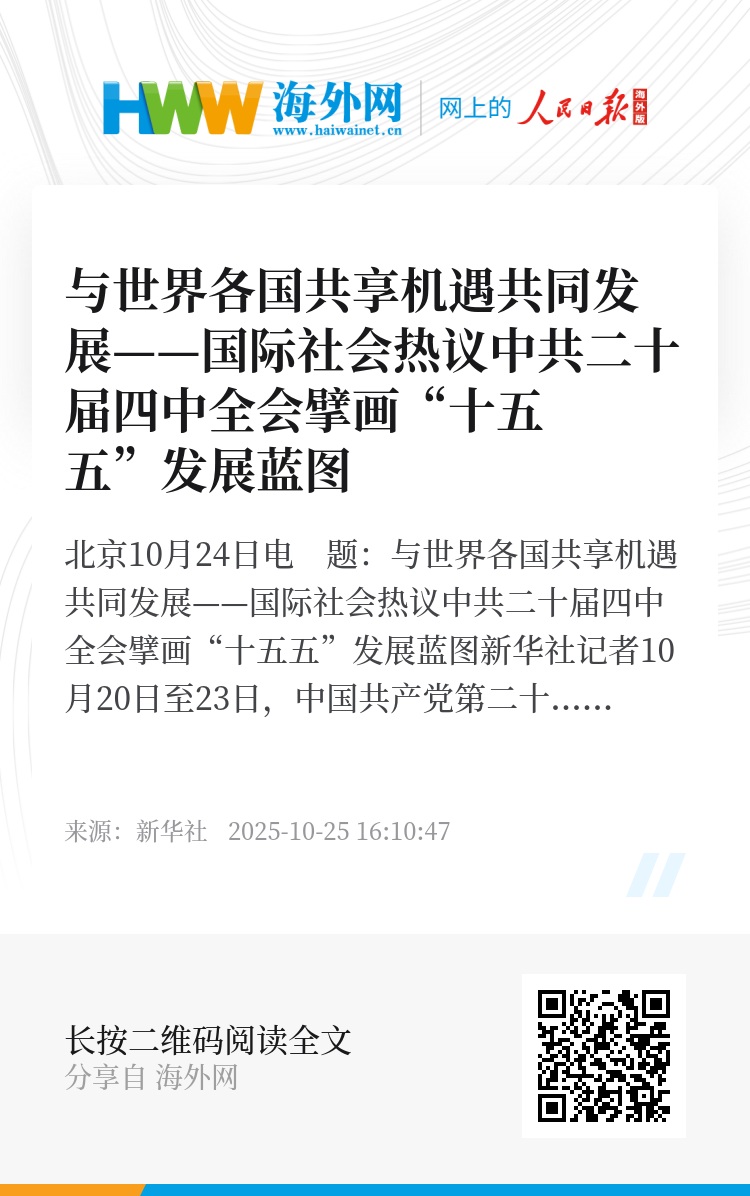 新华社北京10月24日电 题:与世界各国共享机遇共同发展——国际社会热议中共二十届四中全会擘画“十五五”发展蓝图