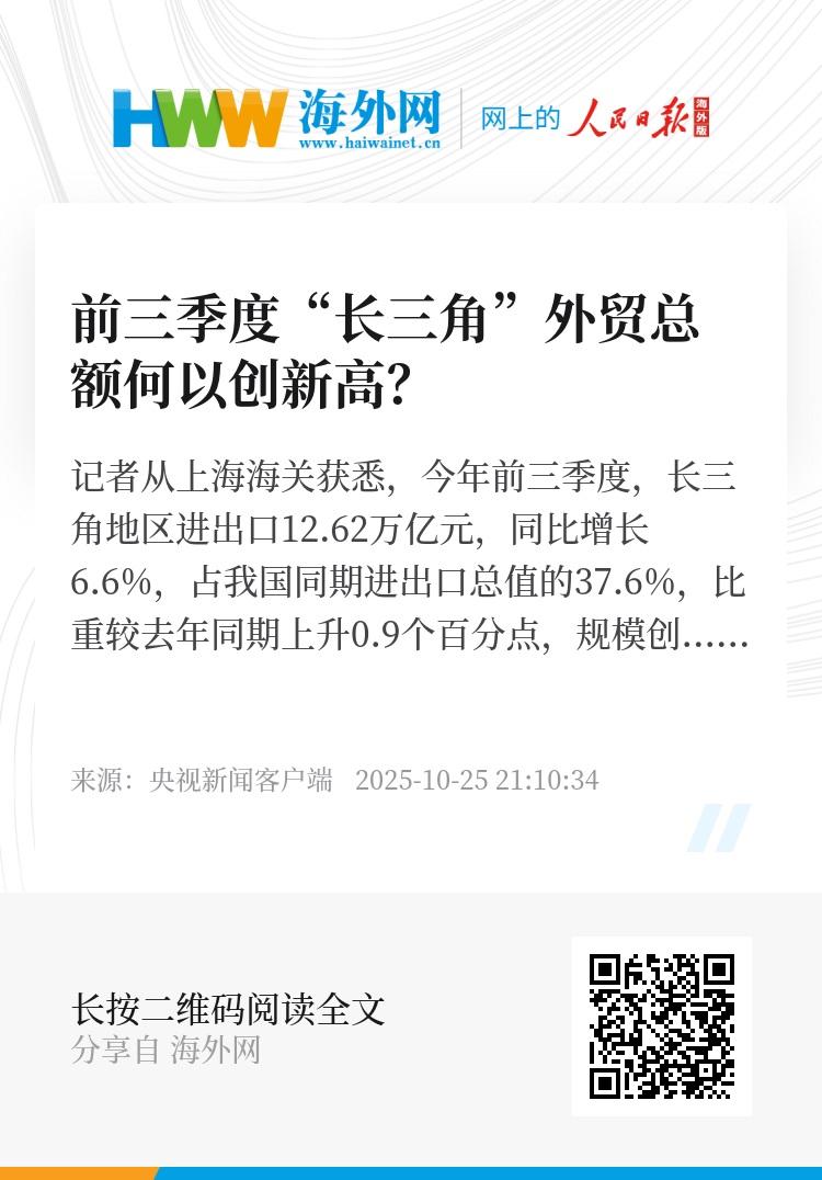 在长三角地区,上海既是全球资源配置的重要枢纽,也是对外开放的重要门户,为区域内的城市提供港口、金融、航运服务于一体的外贸核心支撑。今年前三季度,上海对外贸易继续保持向上向好势头,进出口规模创历史同期新高。