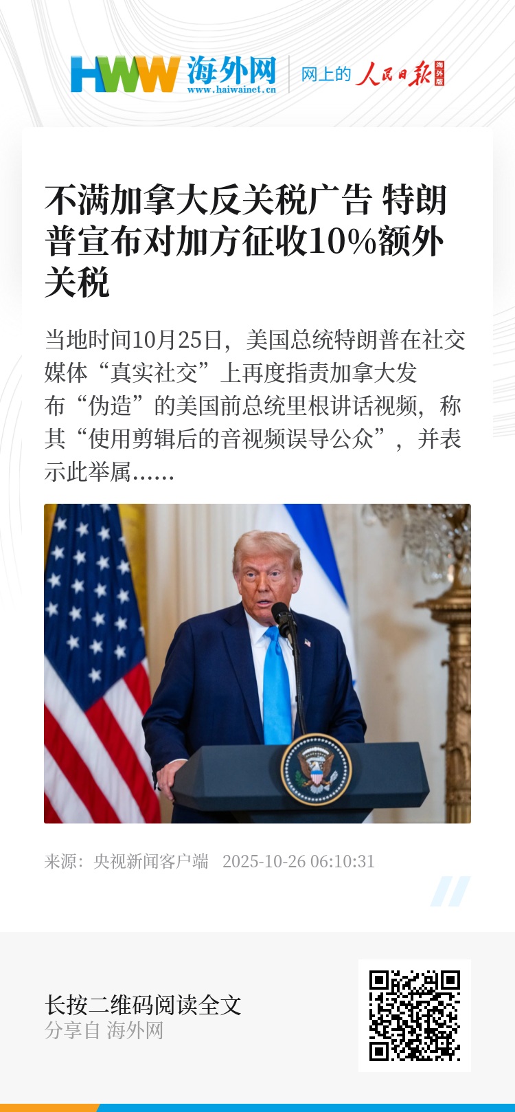 特朗普还宣布,因加拿大“严重歪曲事实并采取敌对行为”,美方将额外对加征收10%的关税予以回应。(央视记者 徐德智)