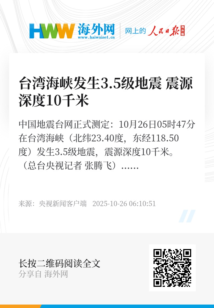中国地震台网正式测定:10月26日05时47分在台湾海峡(北纬23.40度,东经118.50度)发生3.5级地震,震源深度10千米。
