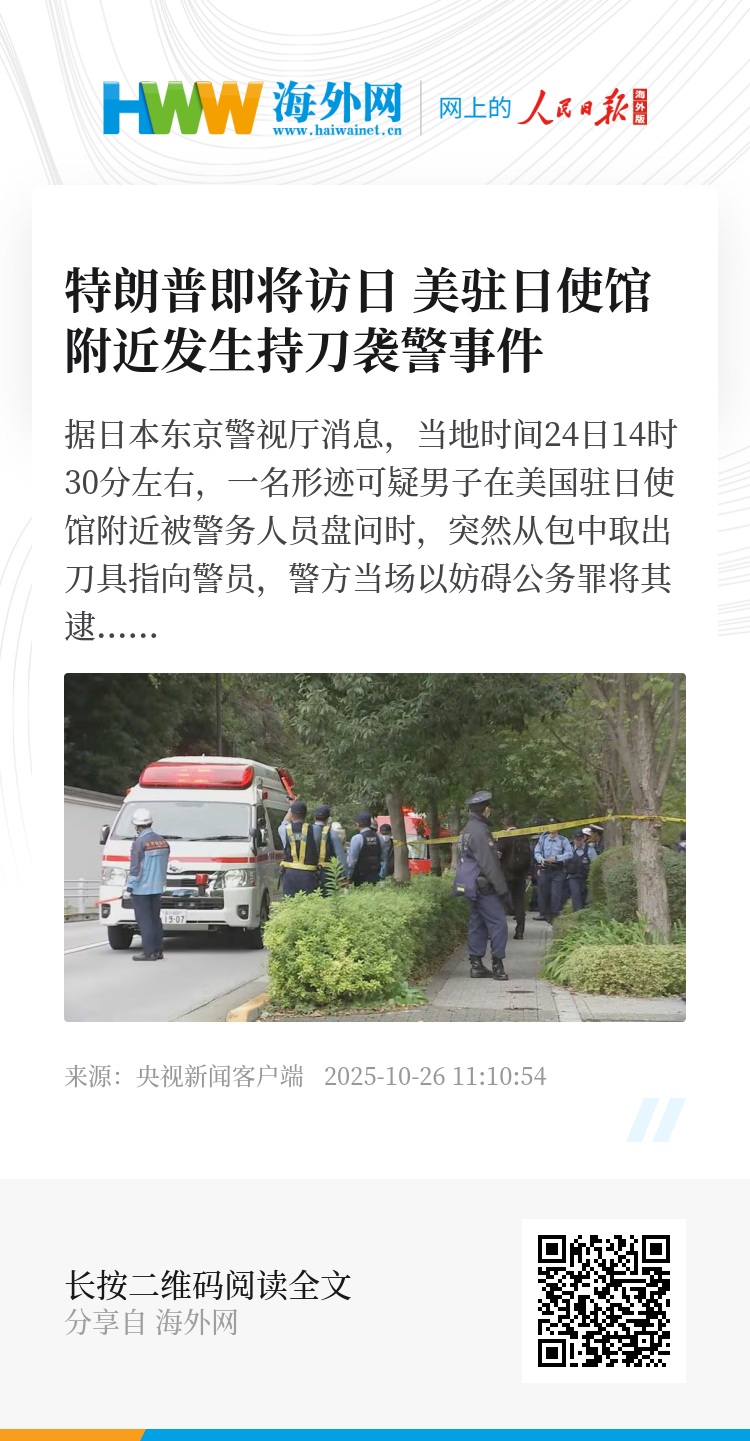 据日本东京警视厅消息,当地时间24日14时30分左右,一名形迹可疑男子在美国驻日使馆附近被警务人员盘问时,突然从包中取出刀具指向警员,警方当场以妨碍公务罪将其逮捕。制伏过程中,一名警员腿部被刺受重伤。