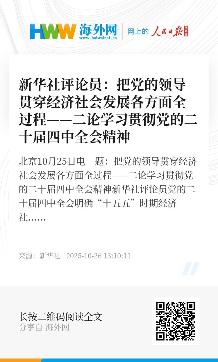 新华社北京10月25日电 题:把党的领导贯穿经济社会发展各方面全过程——二论学习贯彻党的二十届四中全会精神