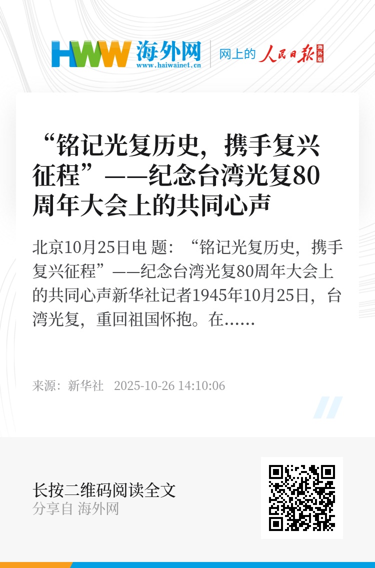 新华社北京10月25日电 题:“铭记光复历史,携手复兴征程”——纪念台湾光复80周年大会上的共同心声
