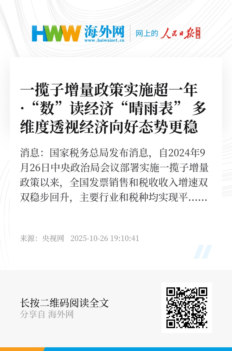 黄立新表示,税收是经济的“晴雨表”,一揽子增量政策落地叠加存量政策实施,发票数据增速稳步回升,反映经济运行稳中向好、企业盈利逐步改善、消费活力持续释放,有力带动税收收入稳中有升。