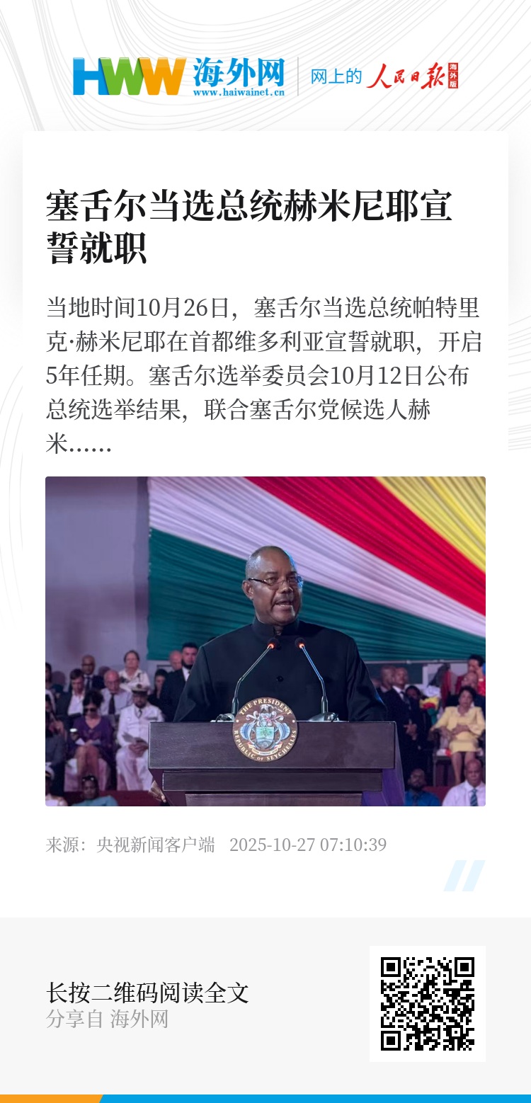 塞舌尔选举委员会10月12日公布总统选举结果,联合塞舌尔党候选人赫米尼耶在总统选举第二轮投票中获胜,当选总统。