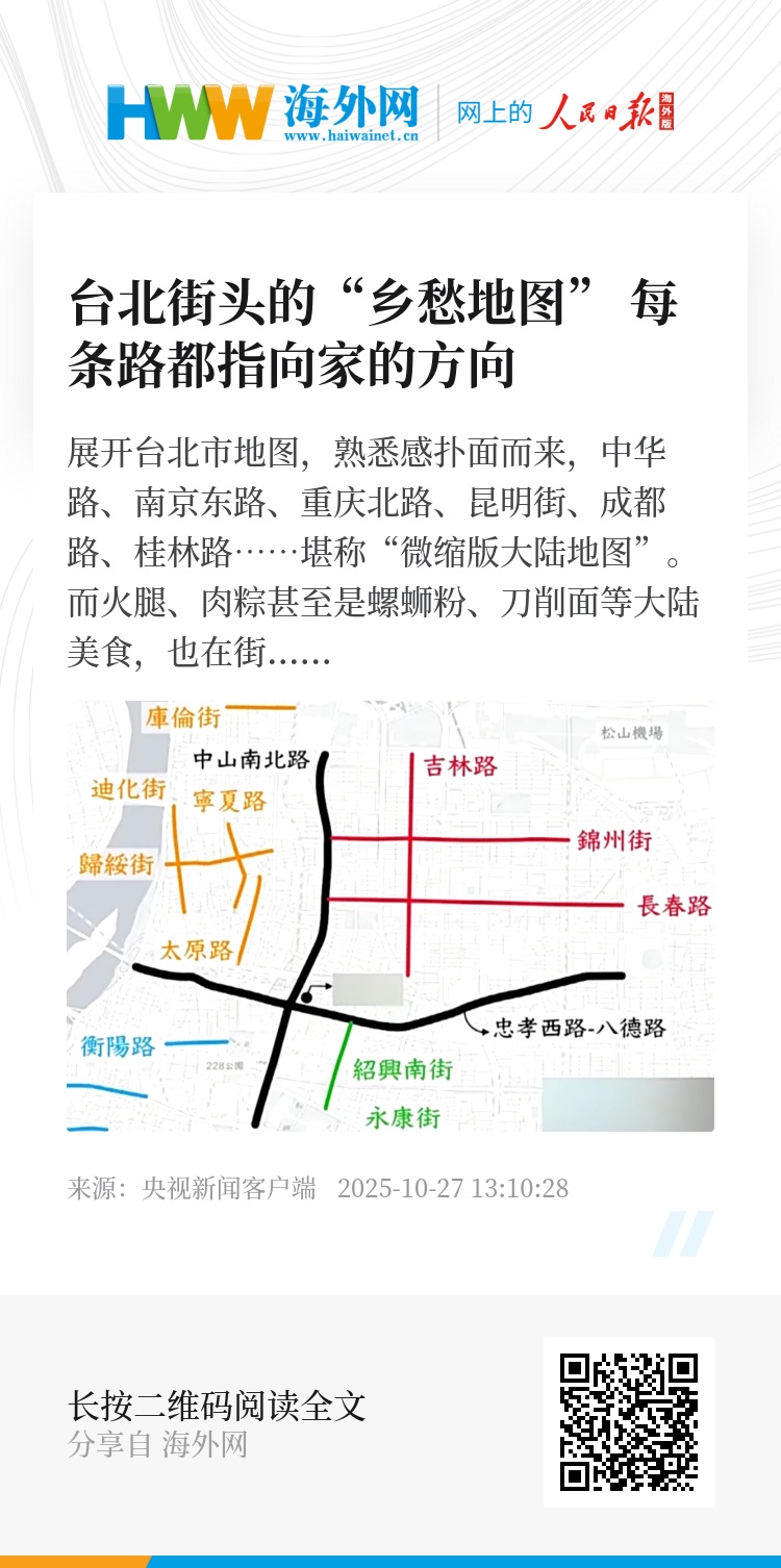 总台央视记者 李峥:从一条条“回家的路”到一份份浓浓的“家乡味”,乡愁在台北的街巷中静静流淌了几十年。纵然时光流转,两岸共同的记忆不会被抹去,而血脉联系则永远无法割断。
