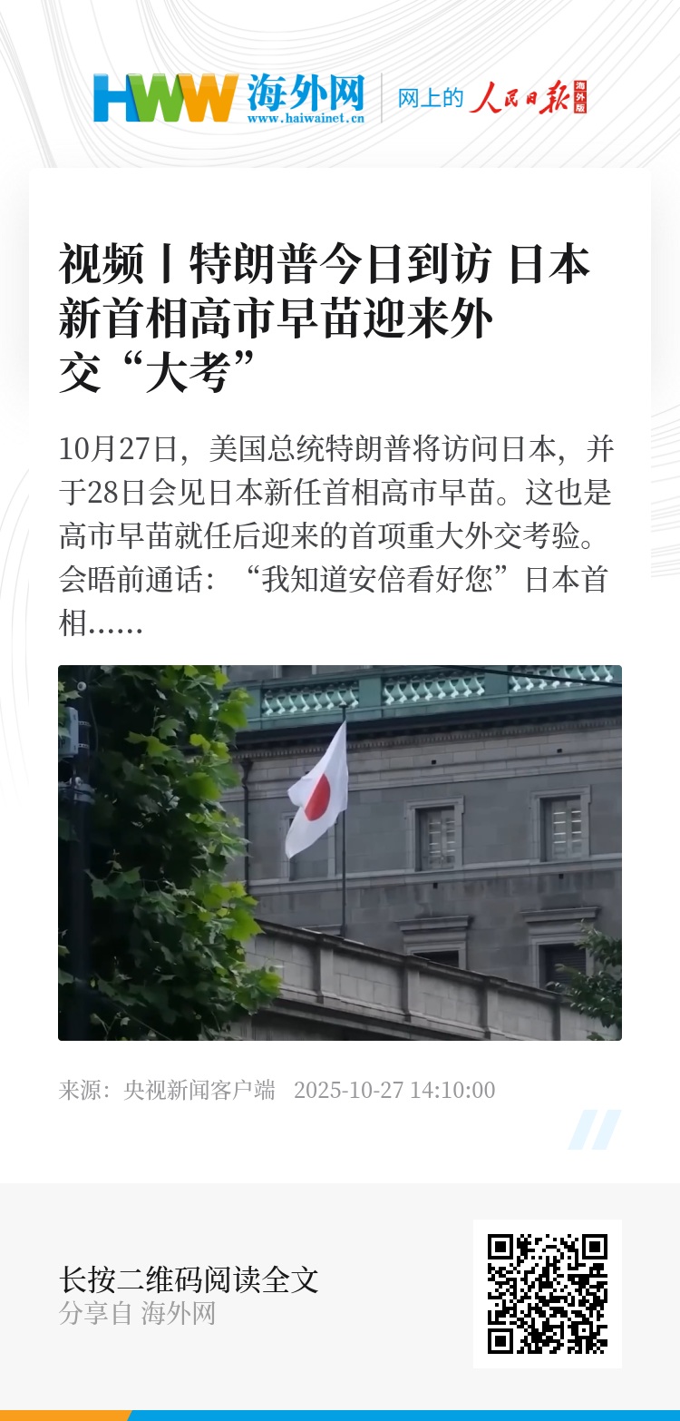 这是高市早苗就任首相后面对的首次重大首脑会晤。如何应对特朗普以及其背后的关税政策等问题,将是对其政治和外交能力的首场“大考”。分析认为,此次会晤若取得成功,将有助于巩固其初启的执政基础,也为日后推进区域安全政策争取美方支持。