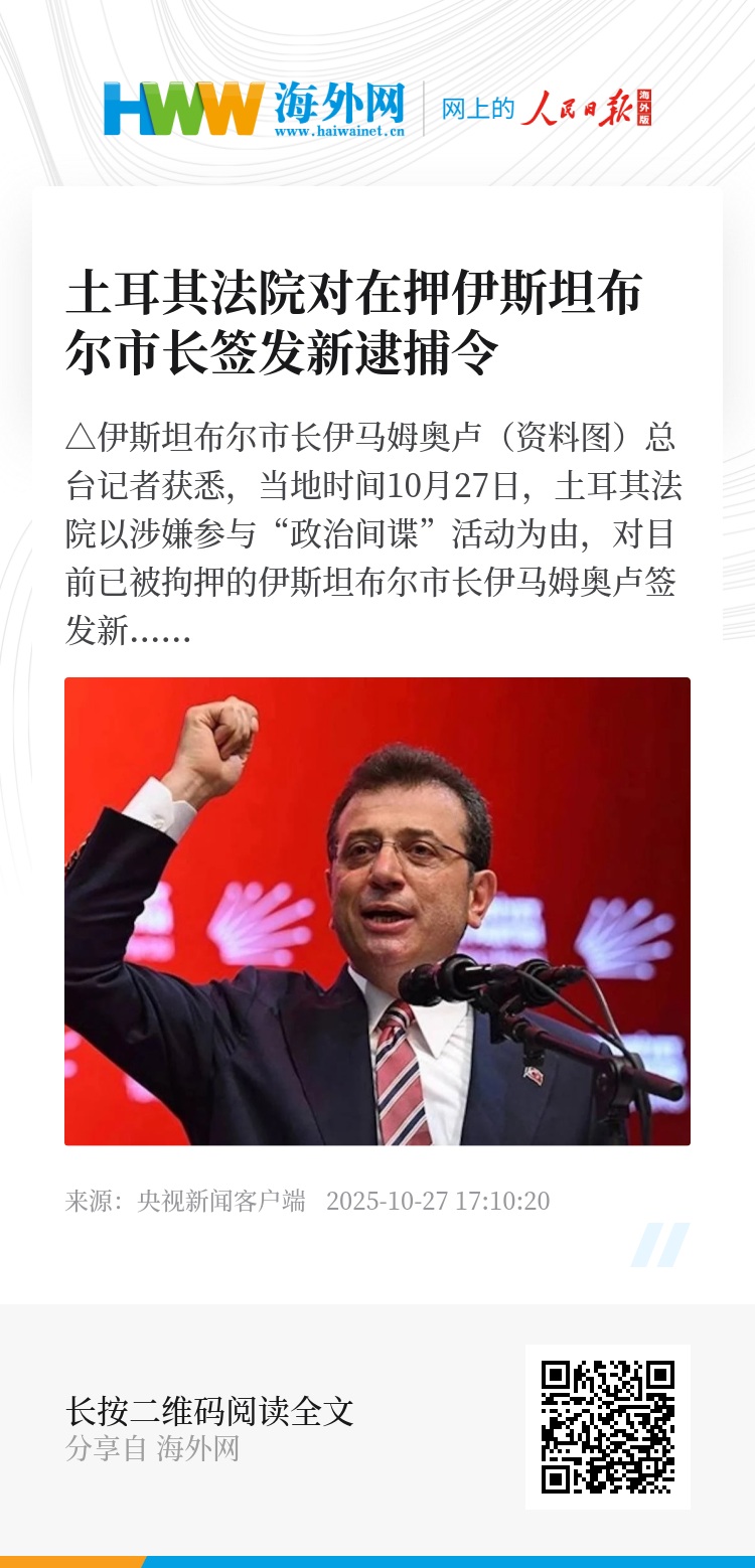 总台记者获悉,当地时间10月27日,土耳其法院以涉嫌参与“政治间谍”活动为由,对目前已被拘押的伊斯坦布尔市长伊马姆奥卢签发新的逮捕令。