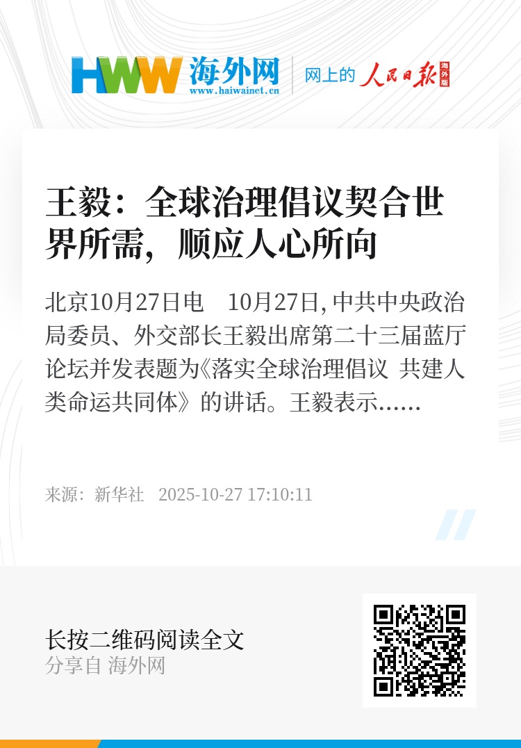 新华社北京10月27日电 10月27日,中共中央政治局委员、外交部长王毅出席第二十三届蓝厅论坛并发表题为《落实全球治理倡议 共建人类命运共同体》的讲话。