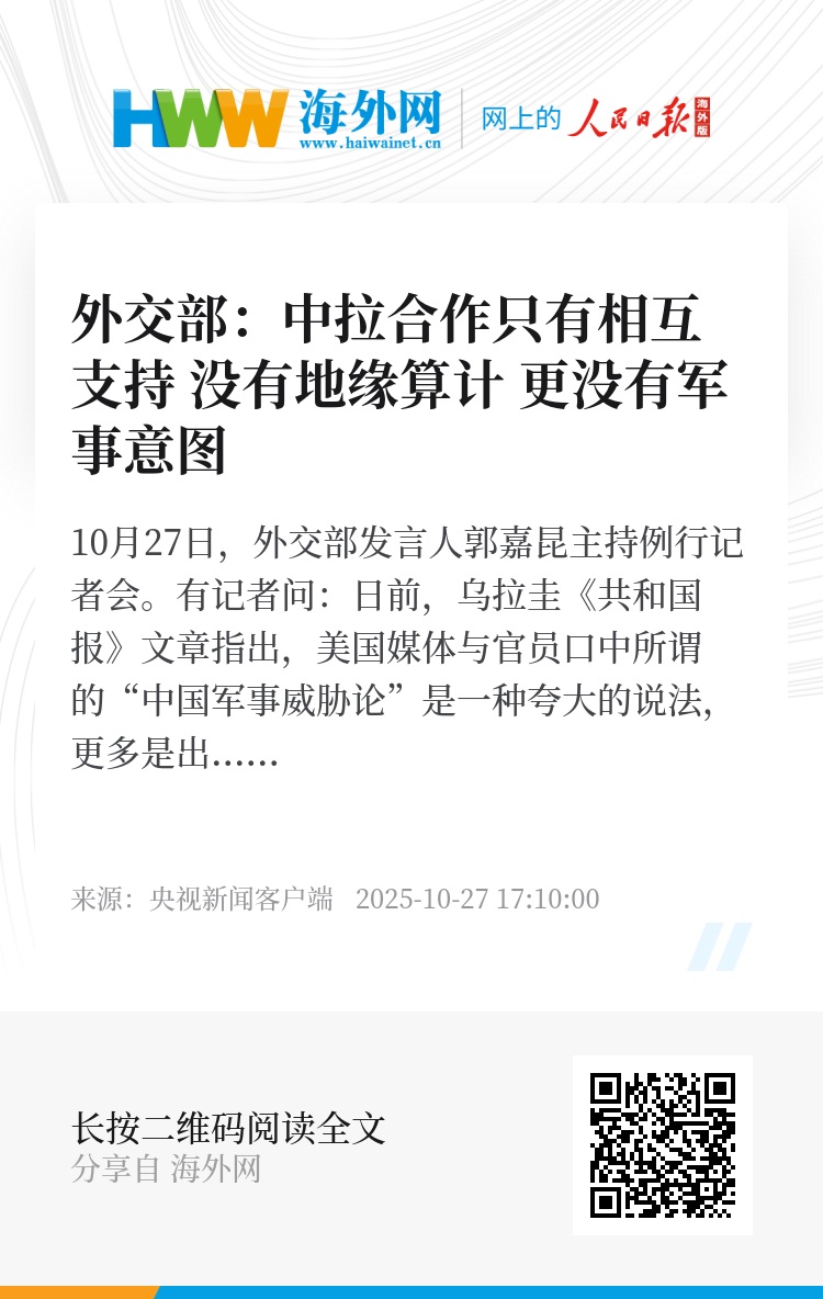 10月27日,外交部发言人郭嘉昆主持例行记者会。有记者问:日前,乌拉圭《共和国报》文章指出,美国媒体与官员口中所谓的“中国军事威胁论”是一种夸大的说法,更多是出于地缘政治需要。美国通过塑造一个外部挑战,得以强化其“西半球安全保障者”角色,从而维护在地区传统地位。请问中方有何评论?