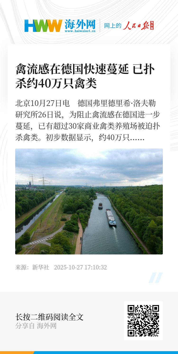 新华社北京10月27日电 德国弗里德里希·洛夫勒研究所26日说,为阻止禽流感在德国进一步蔓延,已有超过30家商业禽类养殖场被迫扑杀禽类。初步数据显示,约40万只鸡、鸭、鹅和火鸡等已被扑杀和处理。