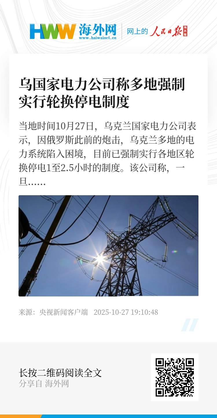 当地时间10月27日,乌克兰国家电力公司表示,因俄罗斯此前的炮击,乌克兰多地的电力系统陷入困境,目前已强制实行各地区轮换停电1至2.5小时的制度。该公司称,一旦局势稳定,这些限制措施将立即解除。
