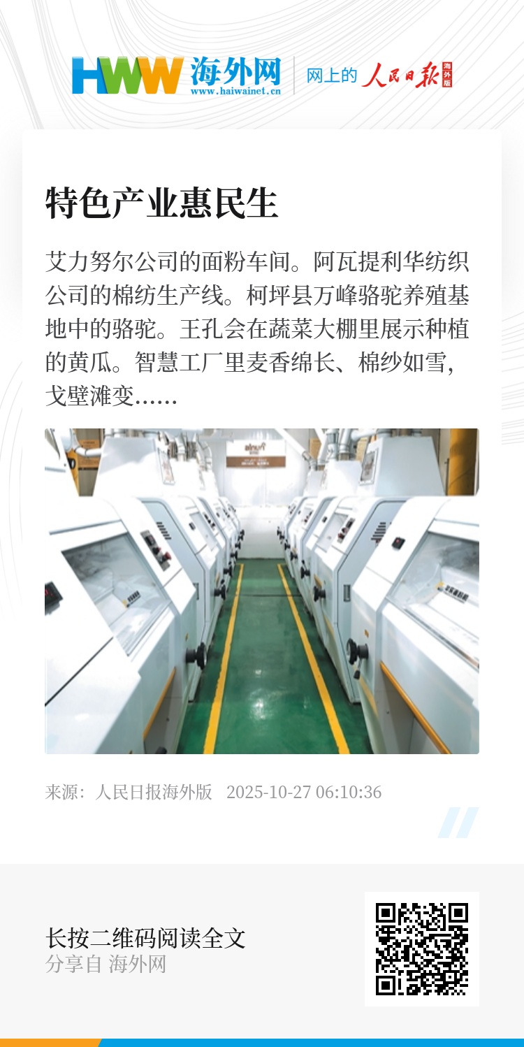 智慧工厂里麦香绵长、棉纱如雪,戈壁滩变“农产绿洲”,“沙漠之舟”驮起增收新希望……一幅“以城促产、以产兴城、以业聚人”的高质量发展画卷,正在天山南麓的新疆维吾尔自治区阿克苏地区徐徐展开,让当地群众共享繁荣发展的美好成果。