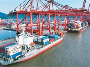 在宁波舟山港金塘港区大浦口集装箱码头,船舶进行集装箱装卸作业。邹训永摄(新华社发)