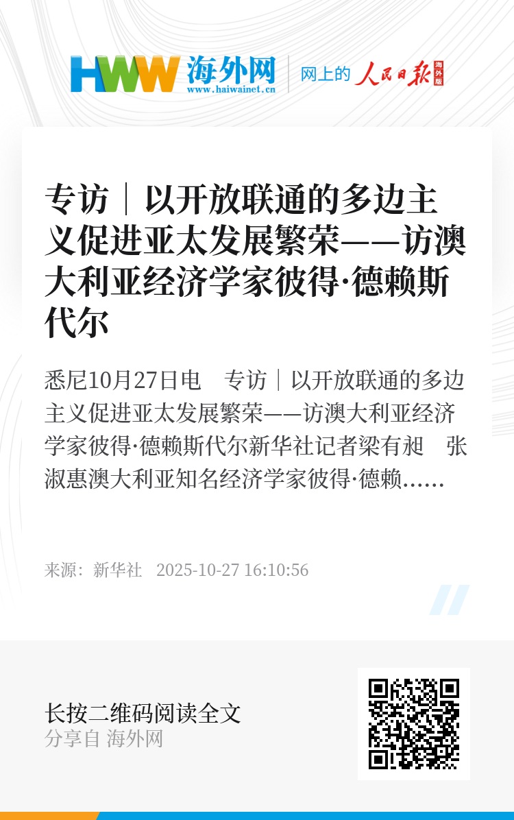 新华社悉尼10月27日电 专访|以开放联通的多边主义促进亚太发展繁荣——访澳大利亚经济学家彼得·德赖斯代尔