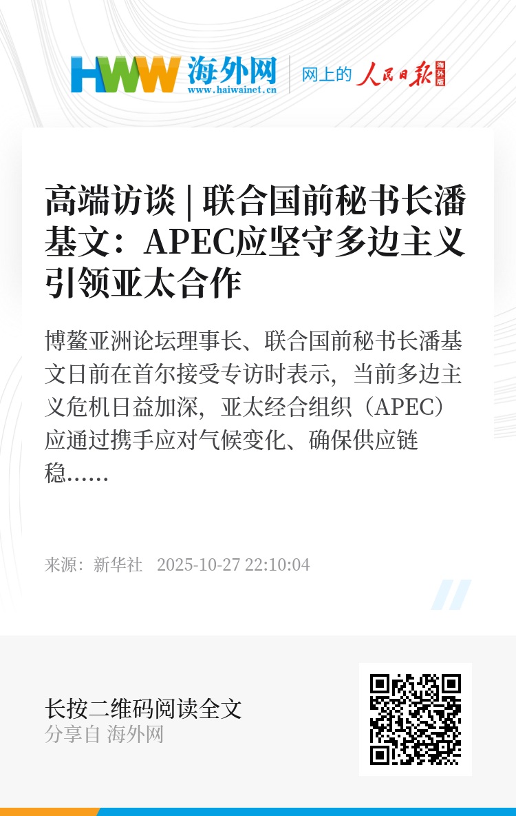 博鳌亚洲论坛理事长、联合国前秘书长潘基文日前在首尔接受新华社专访时表示,当前多边主义危机日益加深,亚太经合组织(APEC)应通过携手应对气候变化、确保供应链稳定、共同制定数字化标准等举措,引领亚太地区经济合作与发展繁荣。