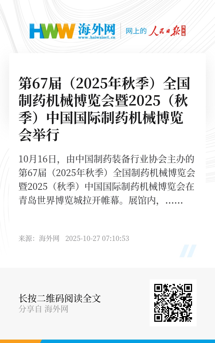 10月16日,由中国制药装备行业协会主办的第67届(2025年秋季)全国制药机械博览会暨2025(秋季)中国国际制药机械博览会在青岛世界博览城拉开帷幕。