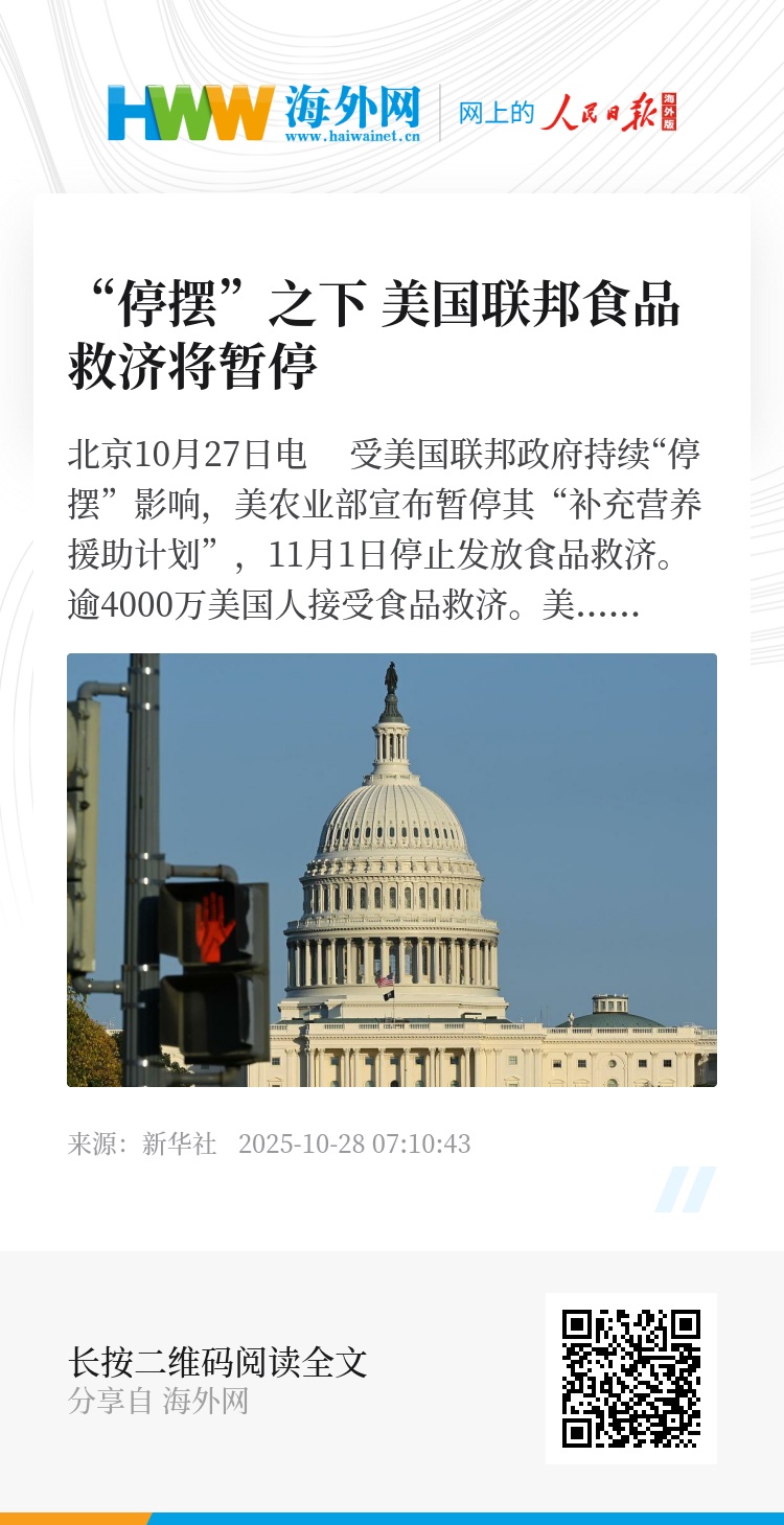 新华社北京10月27日电 受美国联邦政府持续“停摆”影响,美农业部宣布暂停其“补充营养援助计划”,11月1日停止发放食品救济。逾4000万美国人接受食品救济。