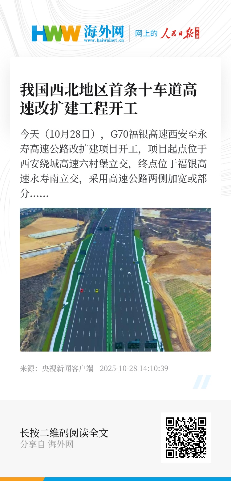 今天(10月28日),G70福银高速西安至永寿高速公路改扩建项目开工,项目起点位于西安绕城高速六村堡立交,终点位于福银高速永寿南立交,采用高速公路两侧加宽或部分单侧加宽方式改扩建,路线全长79.099千米。