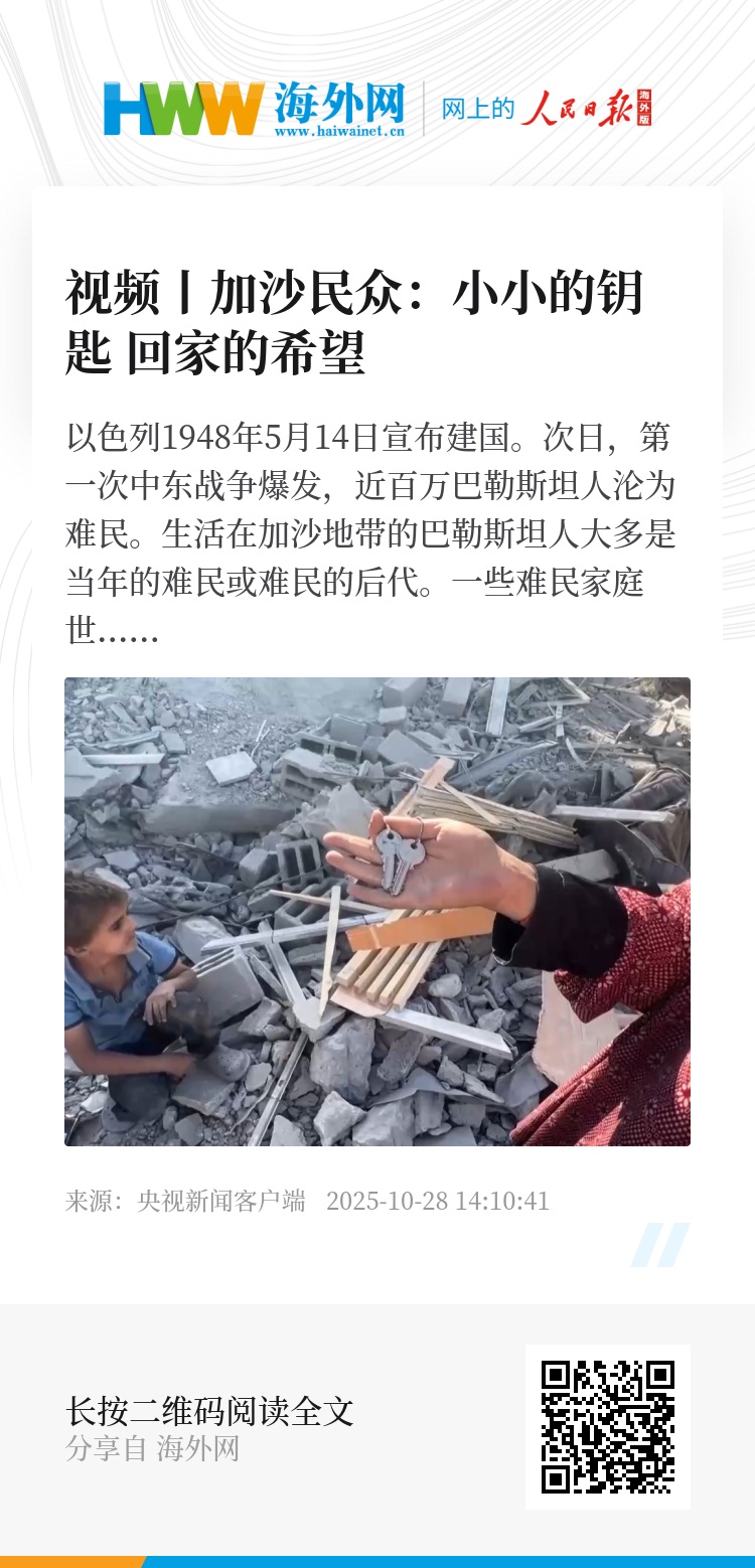由于以军尚未从加沙地带完全撤军,部分加沙民众仍无法返回家园。但是他们还是保留着家门钥匙,他们说自己不会离开加沙地带,小小的钥匙就是一份回家的希望。