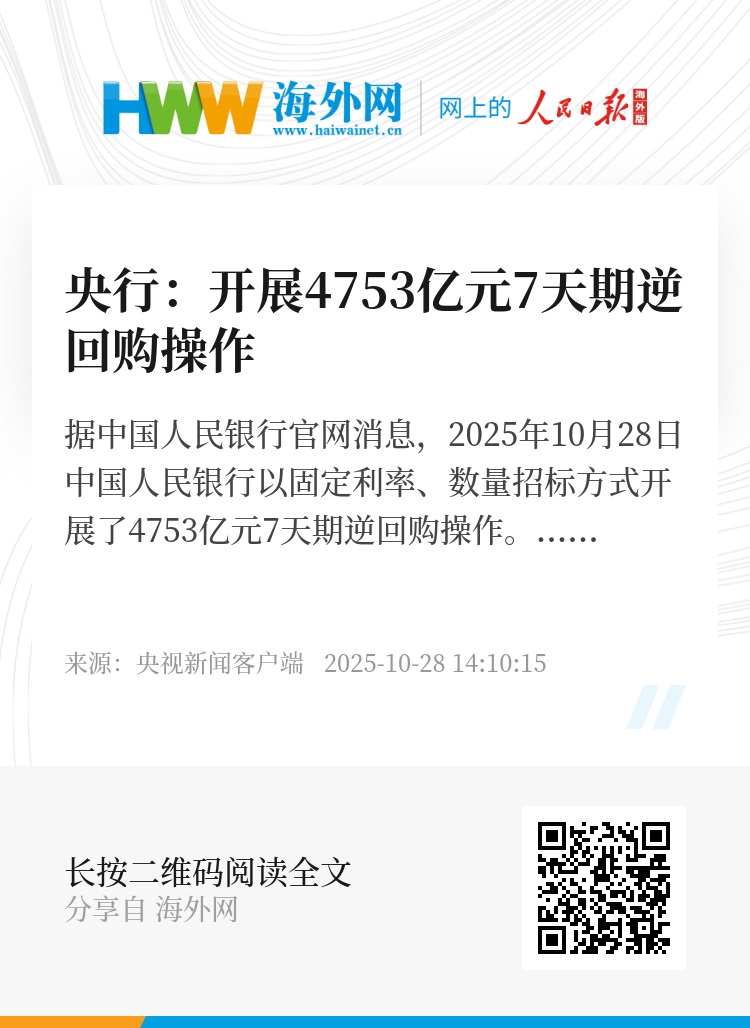 据中国人民银行官网消息,2025年10月28日中国人民银行以固定利率、数量招标方式开展了4753亿元7天期逆回购操作。