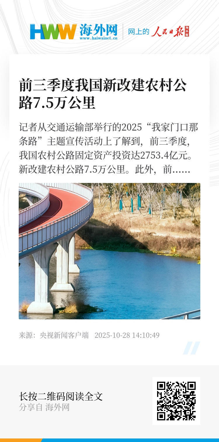 记者从交通运输部举行的2025“我家门口那条路”主题宣传活动上了解到,前三季度,我国农村公路固定资产投资达2753.4亿元。新改建农村公路7.5万公里。