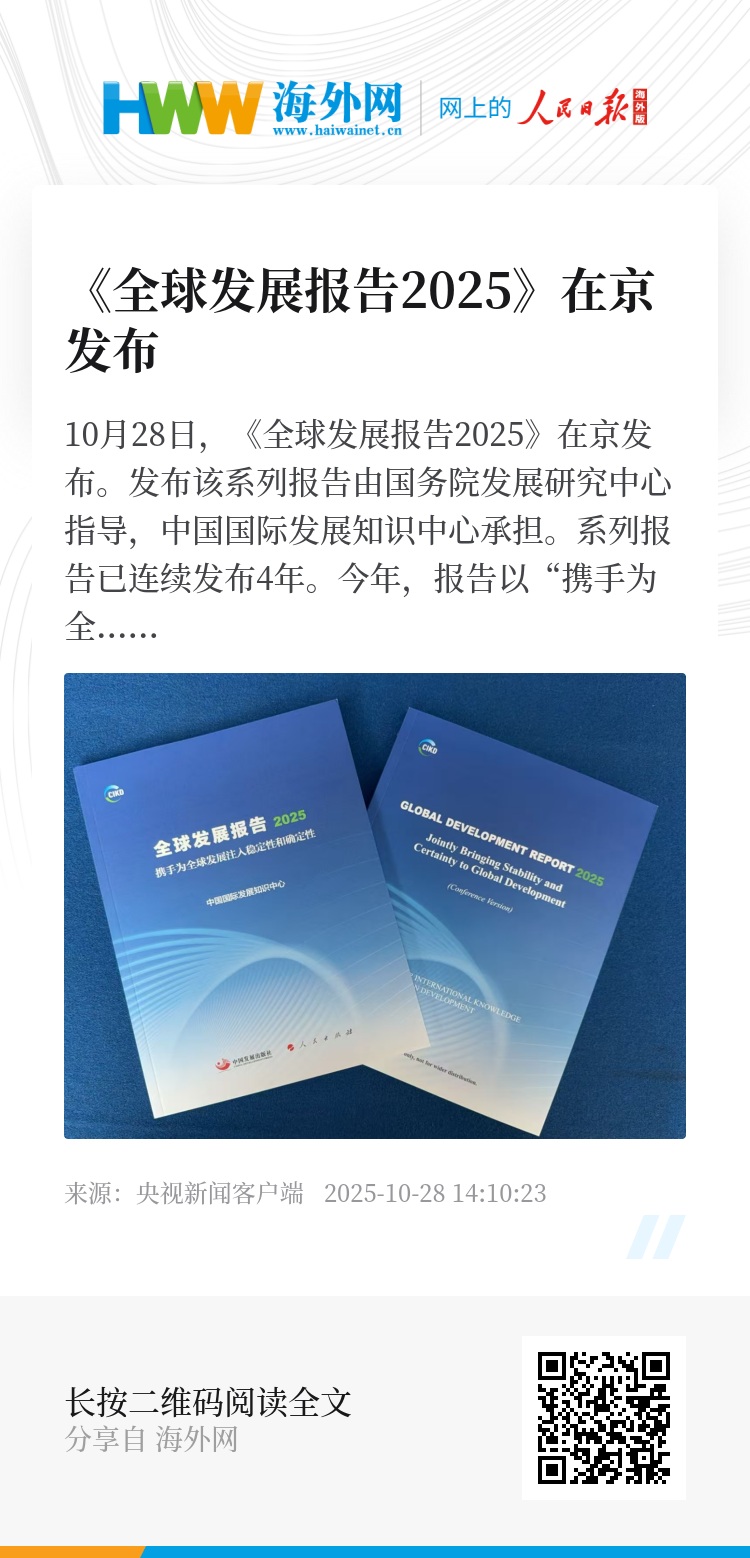 10月28日,《全球发展报告2025》在京发布。发布该系列报告由国务院发展研究中心指导,中国国际发展知识中心承担。系列报告已连续发布4年。