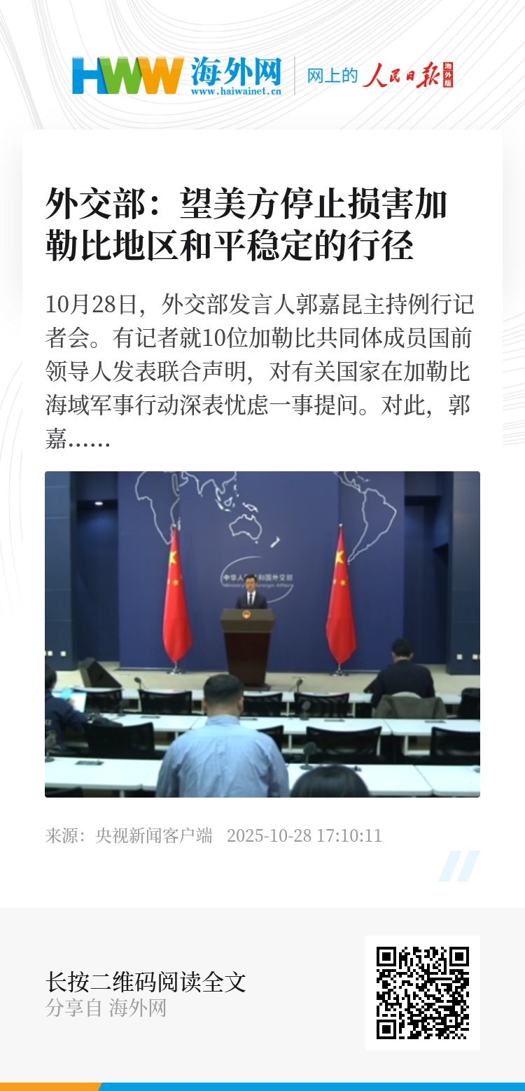 10月28日,外交部发言人郭嘉昆主持例行记者会。有记者就10位加勒比共同体成员国前领导人发表联合声明,对有关国家在加勒比海域军事行动深表忧虑一事提问。