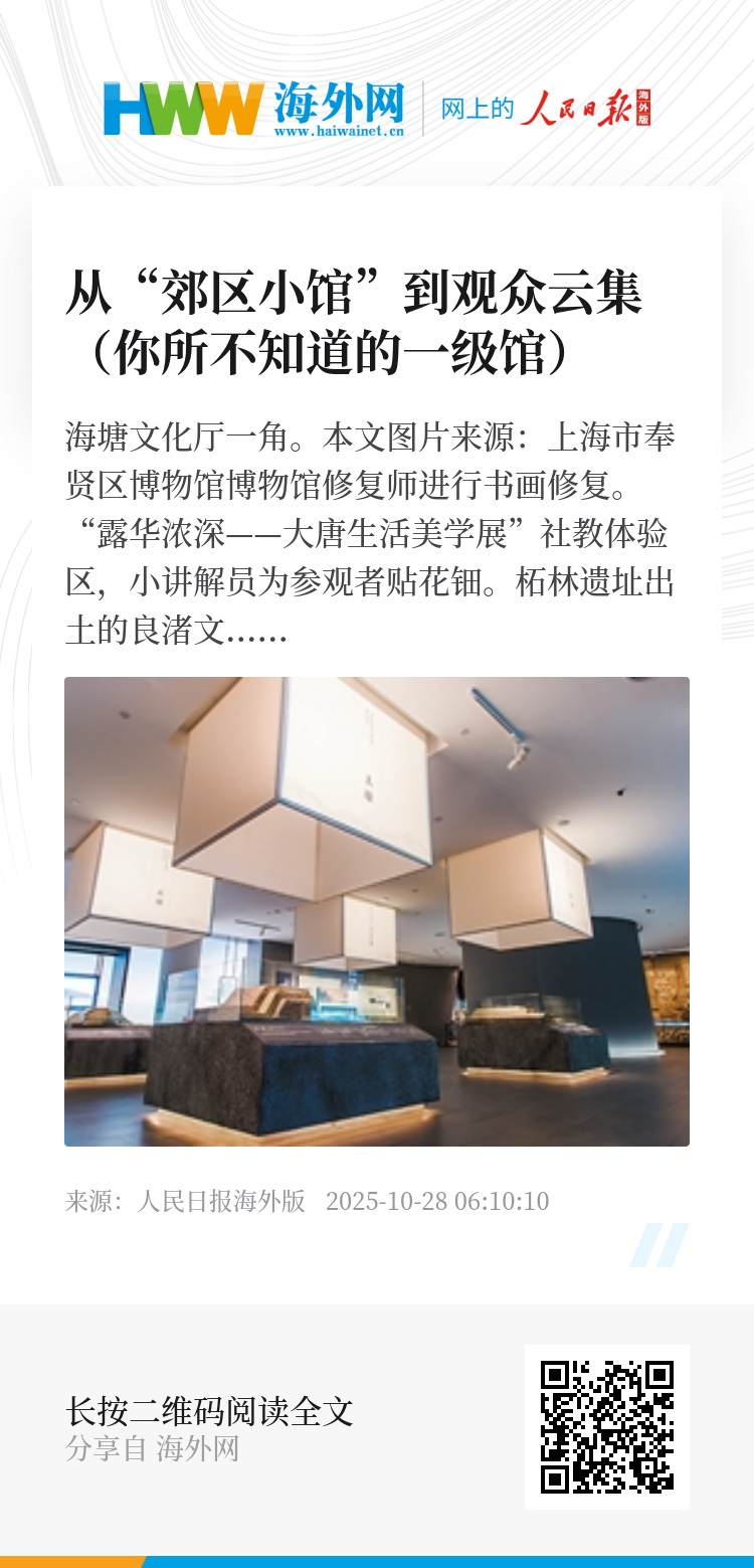 “奉贤区博物馆位于上海市郊,展览要有足够的吸引力,市民游客才更愿意来。”张雪松说,“大馆做通史,我们做专题;大馆重文物,我们重体验。”正是这种差异化策略,让奉贤区博物馆从长三角地区众多文博场馆中脱颖而出。