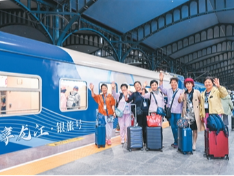 旅客与黑龙江开行的首趟“悠享龙江·银旅号”适老化旅游专列合影留念。原勇摄(人民视觉)