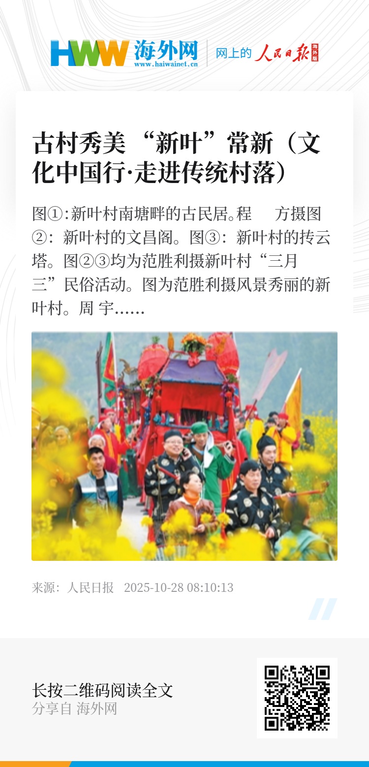 如今,新叶村每年举办传统与现代结合的“三月三”农耕文化体验和民俗活动,就是保持乡土文化活力、让文化遗产真正“活”在当下的一个缩影。2025年“三月三”活动,单日吸引游客1.2万人次。