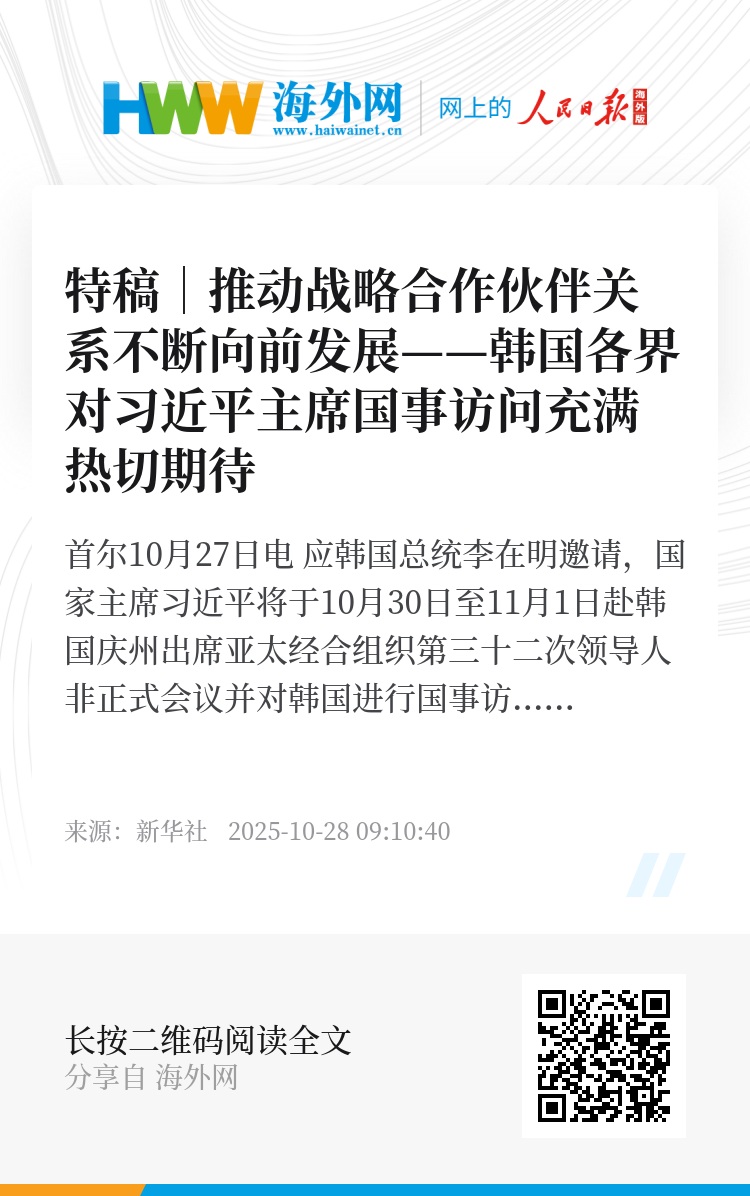 “热烈欢迎习近平主席对韩国进行国事访问。”韩国国会议员尹厚德表示,“这次访问将为推动双边睦邻友好关系深入发展带来重要契机,期待双方领导人进一步凝聚两国共识,推动经贸、人文等各领域交流合作更加活跃,并为地区和平与发展注入新动力。”