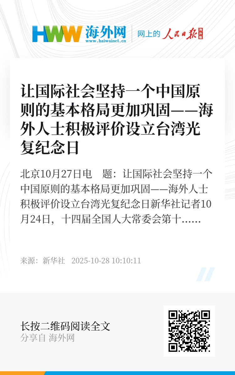 新华社北京10月27日电 题:让国际社会坚持一个中国原则的基本格局更加巩固——海外人士积极评价设立台湾光复纪念日