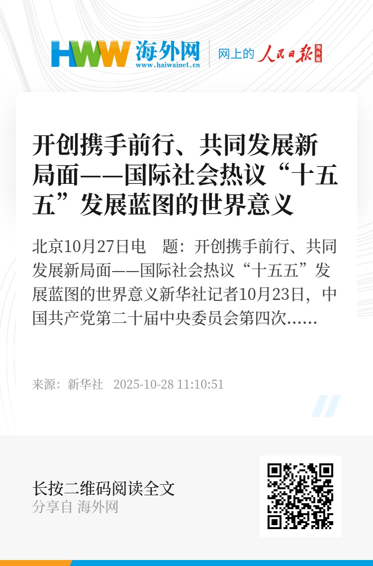 新华社北京10月27日电 题:开创携手前行、共同发展新局面——国际社会热议“十五五”发展蓝图的世界意义