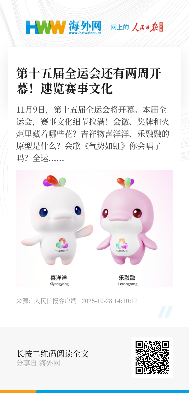 11月9日,第十五届全运会将开幕。本届全运会,赛事文化细节拉满!会徽、奖牌和火炬里藏着哪些花?吉祥物喜洋洋、乐融融的原型是什么?会歌《气势如虹》你会唱了吗?全运会进入2周倒计时,收藏这些十五运会的知识点,期待开幕!
