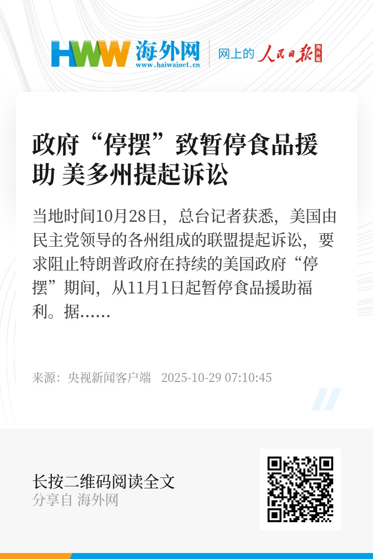 据悉,在美国农业部表示不会动用60亿美元的应急资金支付补充营养援助计划(也称为食品券)福利后,来自25个州和哥伦比亚特区的总检察长和州长向波士顿联邦法院提起了诉讼。据了解,该福利为超过4100万低收入美国人提供食品援助。(总台记者 张颖哲)