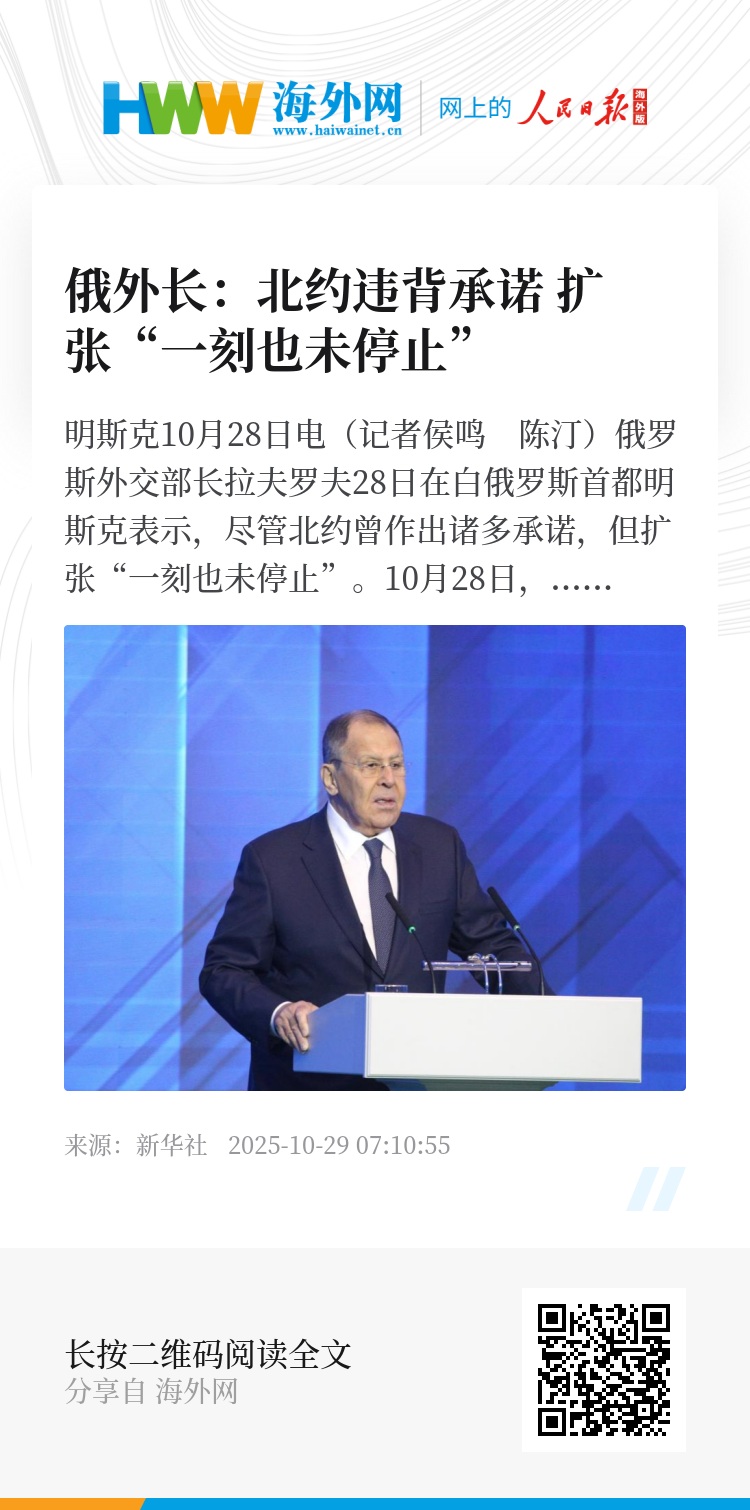 新华社明斯克10月28日电(记者侯鸣 陈汀)俄罗斯外交部长拉夫罗夫28日在白俄罗斯首都明斯克表示,尽管北约曾作出诸多承诺,但扩张“一刻也未停止”。
