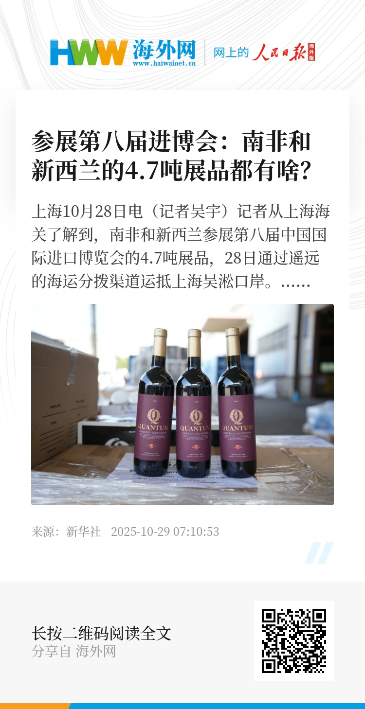 新华社上海10月28日电(记者吴宇)记者从上海海关了解到,南非和新西兰参展第八届中国国际进口博览会的4.7吨展品,28日通过遥远的海运分拨渠道运抵上海吴淞口岸。据介绍,这些展品共计12批次,其中南非展品有葡萄酒、茶、果干,新西兰展品有果汁、蜂蜜、饮用水等。
