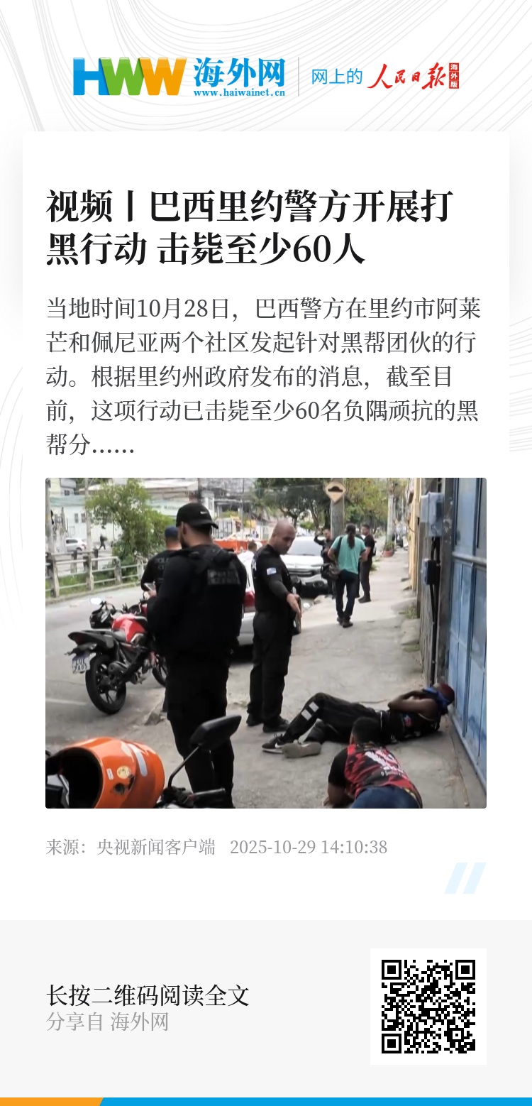 根据里约州政府发布的消息,截至目前,这项行动已击毙至少60名负隅顽抗的黑帮分子,另有81人被捕。