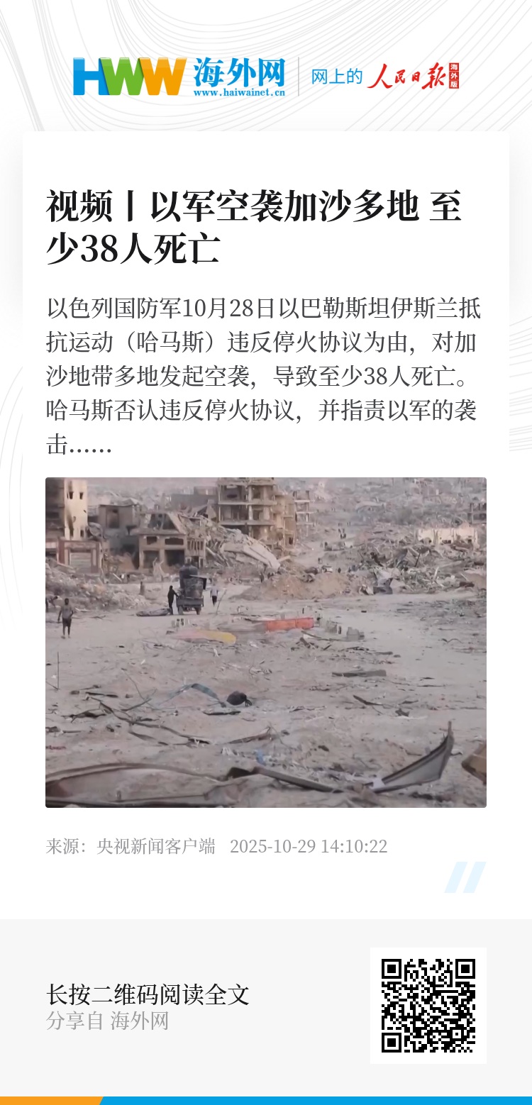 以色列国防军10月28日以巴勒斯坦伊斯兰抵抗运动(哈马斯)违反停火协议为由,对加沙地带多地发起空袭,导致至少38人死亡。