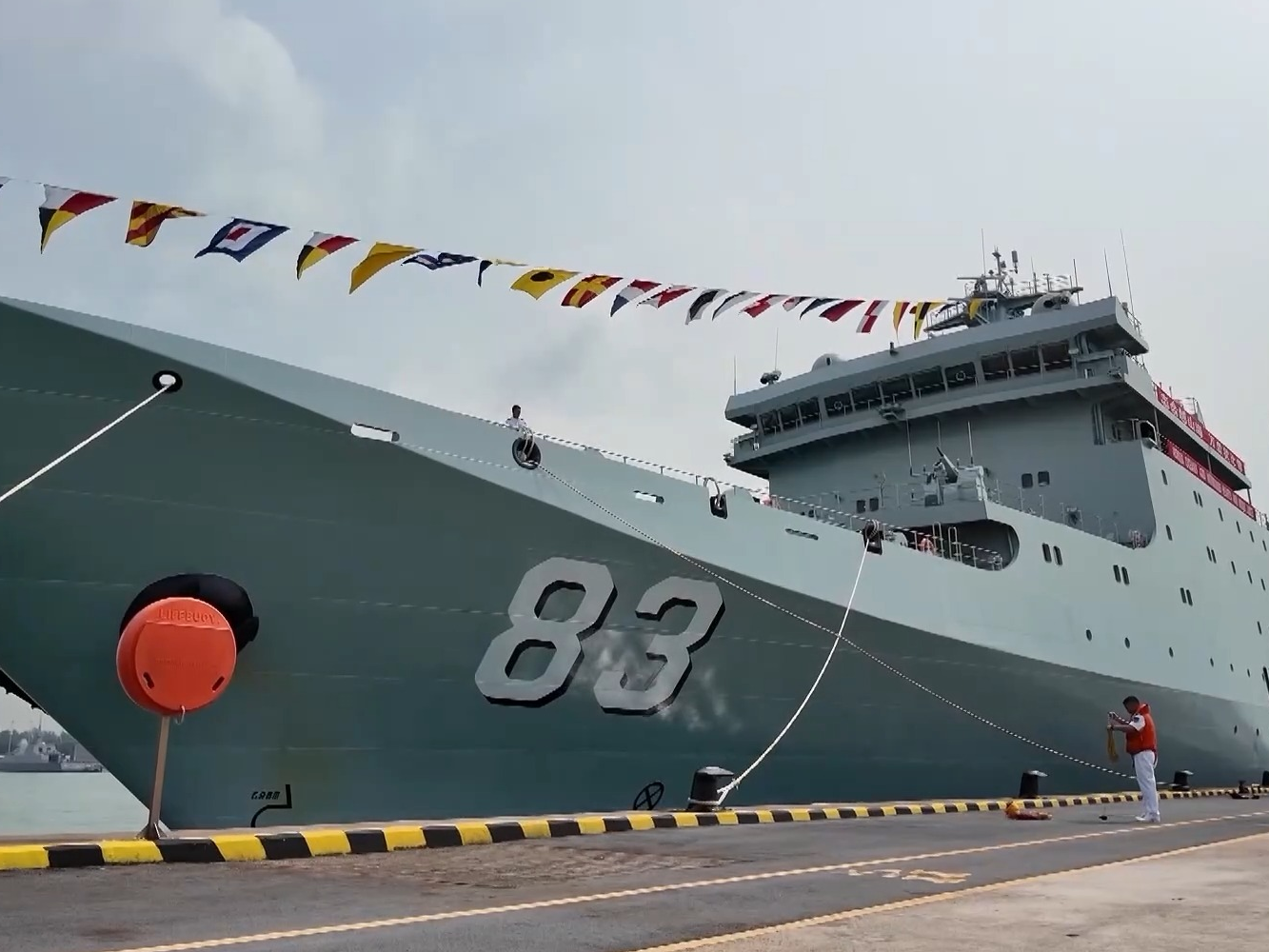 总台记者 刘畅:28日上午10点,中国海军戚继光舰、沂蒙山舰抵达新加坡樟宜港码头,中国驻新加坡大使馆领导及工作人员、中国留学生代表、新加坡海军官兵代表来到码头举行欢迎仪式,迎接编队的到来。