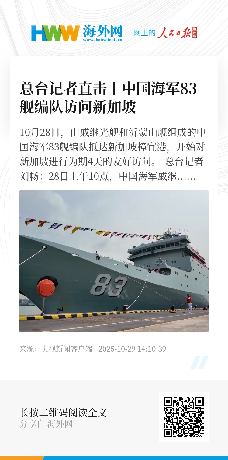 10月28日,由戚继光舰和沂蒙山舰组成的中国海军83舰编队抵达新加坡樟宜港,开始对新加坡进行为期4天的友好访问。